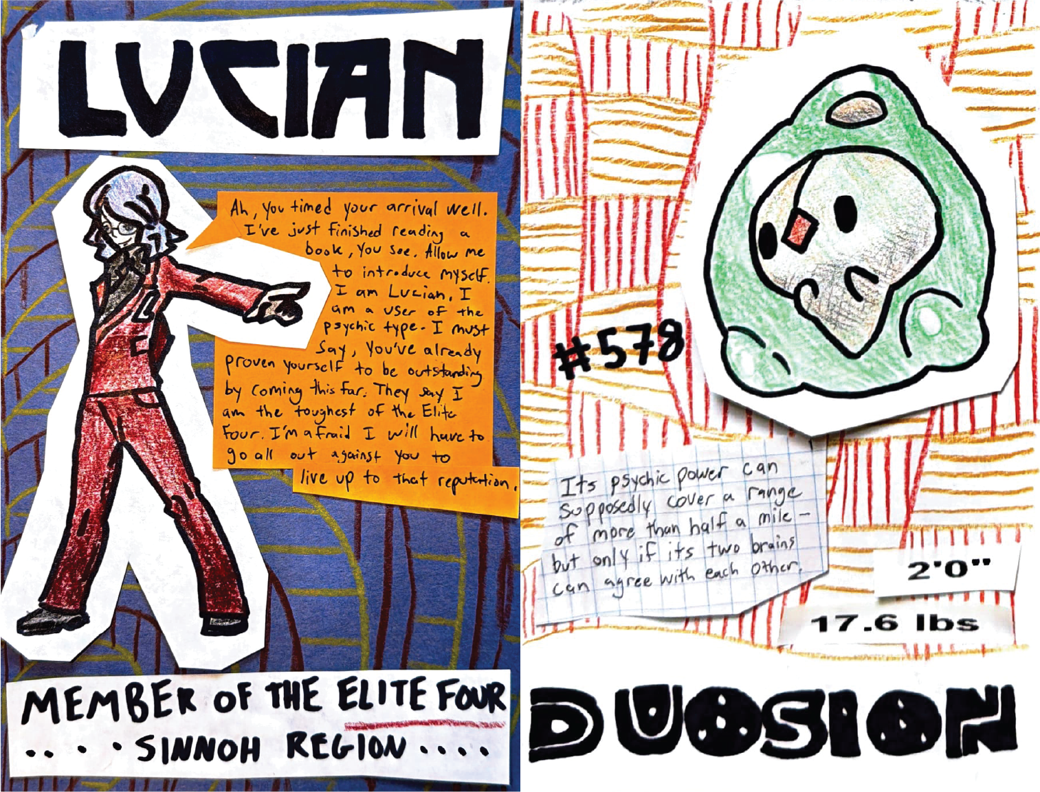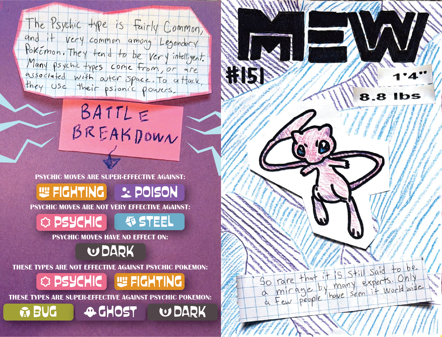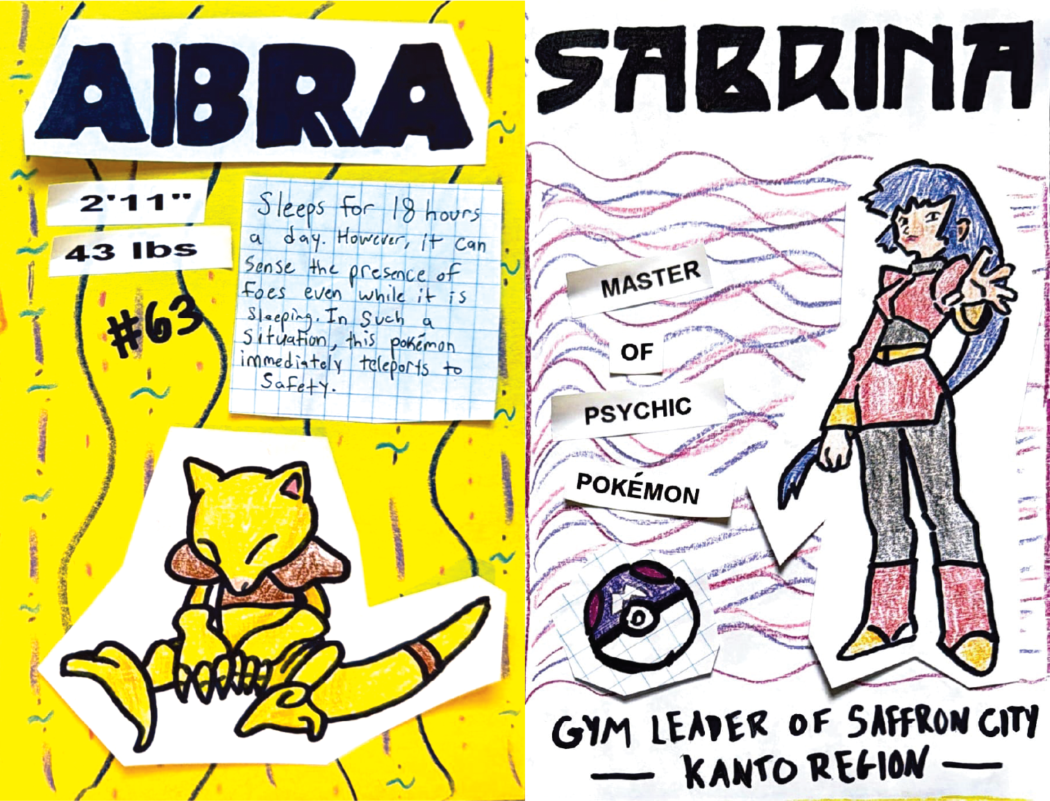 To achieve a childlike feel, I leaned into a DIY style. I wanted each page to feel hand crafted, so I created my illustrations with colored pencils and permanent marker. My process included both digital and physical iteration. I started by designing a basic layout for a page on Adobe Illustrator and then printing out that draft. From there I would tape the printed draft to a window so light could shine through, then trace the Pokémon/trainer outline and heading text with permanent marker onto a separate sheet of paper. I then cut out these drawings and physically constructed the rest of the page with construction paper, tape, composition book pages, colored pencil patterns, and other miscellaneous cutouts when needed. This made each page feel like a unique collage. Next, I scanned each page with the Adobe Scan app and organized my scanned pages for print in Illustrator.