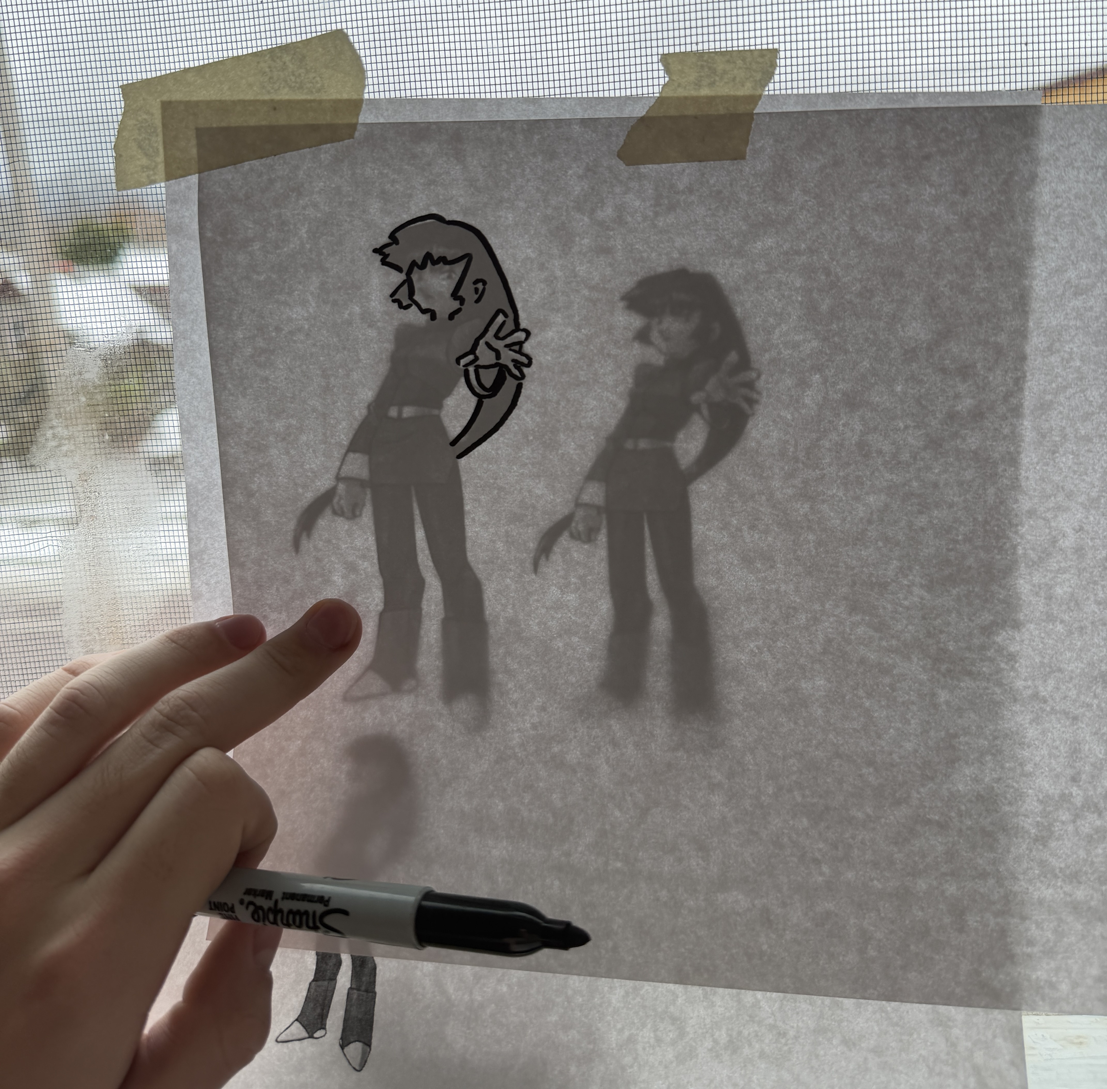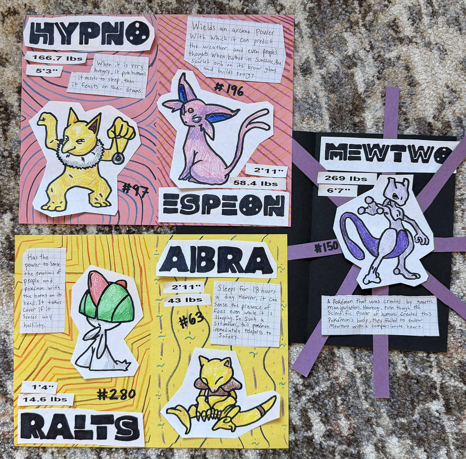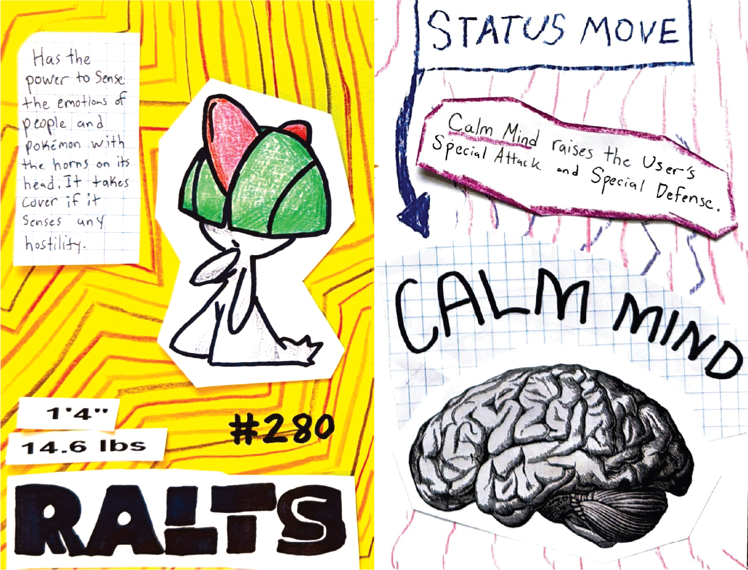 To achieve a childlike feel, I leaned into a DIY style. I wanted each page to feel hand crafted, so I created my illustrations with colored pencils and permanent marker. My process included both digital and physical iteration. I started by designing a basic layout for a page on Adobe Illustrator and then printing out that draft. From there I would tape the printed draft to a window so light could shine through, then trace the Pokémon/trainer outline and heading text with permanent marker onto a separate sheet of paper. I then cut out these drawings and physically constructed the rest of the page with construction paper, tape, composition book pages, colored pencil patterns, and other miscellaneous cutouts when needed. This made each page feel like a unique collage. Next, I scanned each page with the Adobe Scan app and organized my scanned pages for print in Illustrator.