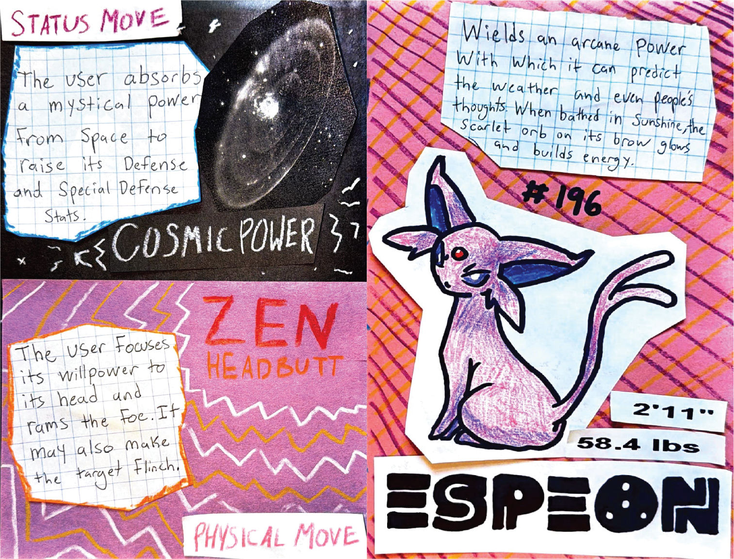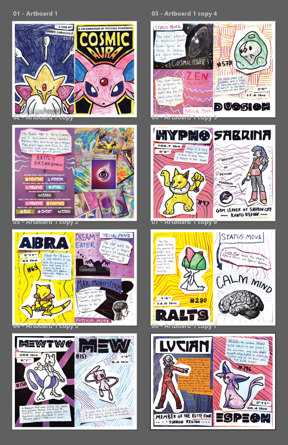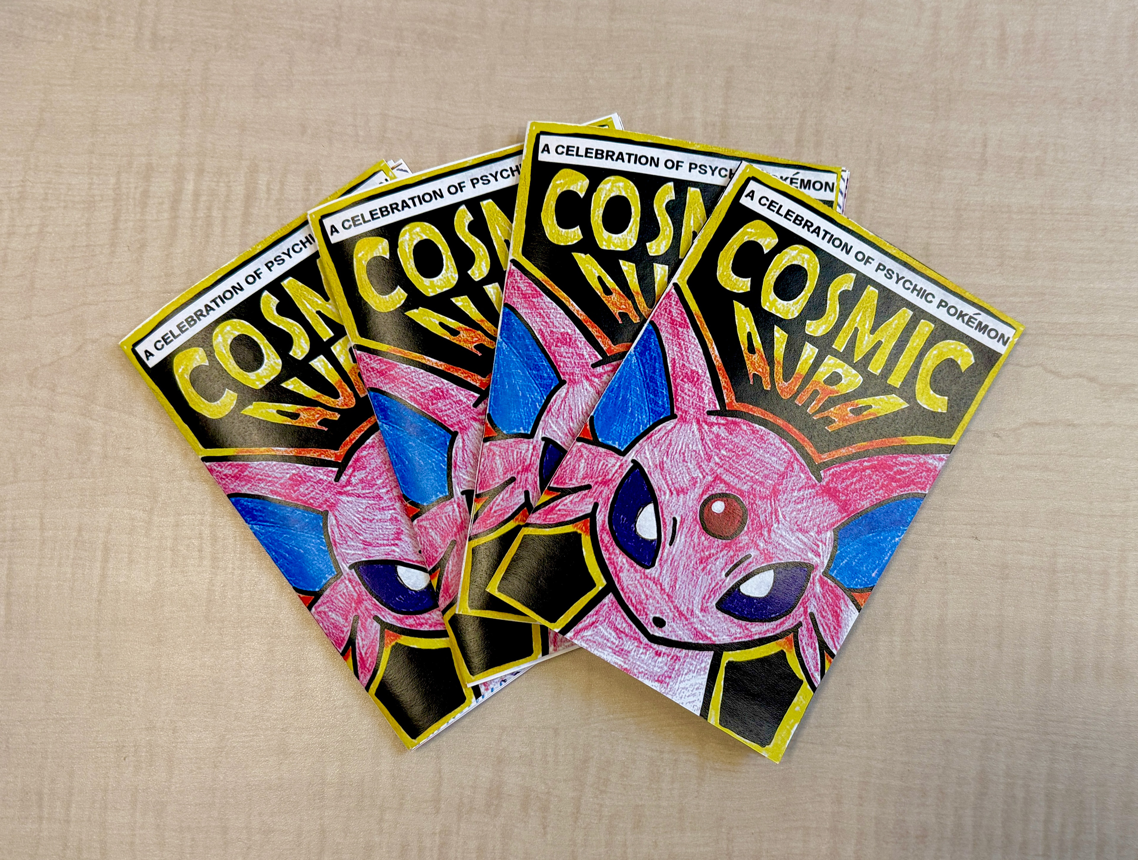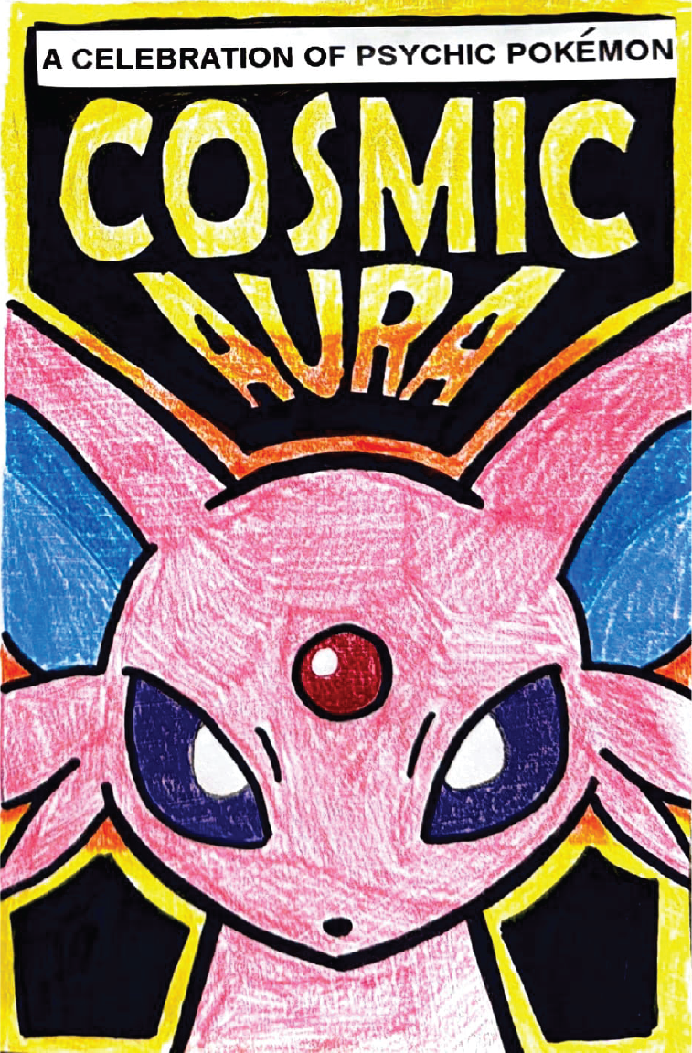 Cosmic Aura is a zine inspired by my lifelong love of the Pokémon franchise. As a young kid, I played Pokémon video games on my Nintendo DS, collected cards, and watched the TV show. I have always enjoyed immersing myself in the whimsical world and collecting mystical creatures. Through the creation of this zine, I aimed to capture the childlike wonder I associate with Pokémon.