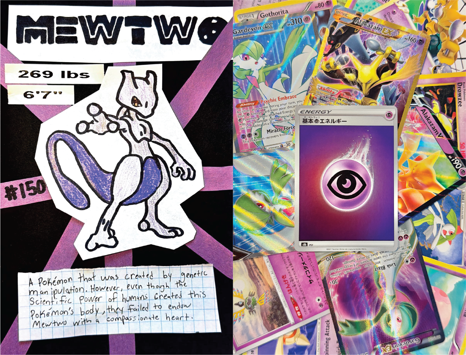The franchise features many “types” of Pokémon, from physical elements like Fire and Water to more abstract concepts like Ghost and Dark. My personal favorite type is Psychic, so I decided to highlight this often-overlooked type in my zine. The Psychic type is often associated with concepts such as outer space, dreams, telekinesis, and teleportation. I hoped to convey these themes with a trippy vibe through my use of color and hand drawn patterns. I also wanted the zine to feel like a celebration of the Psychic type, so I included pages that highlight particularly unique Pokémon species, notable trainers, and dazzling battle moves. The goal is for people to feel hooked and excited about the Psychic type as they flip through my zine.