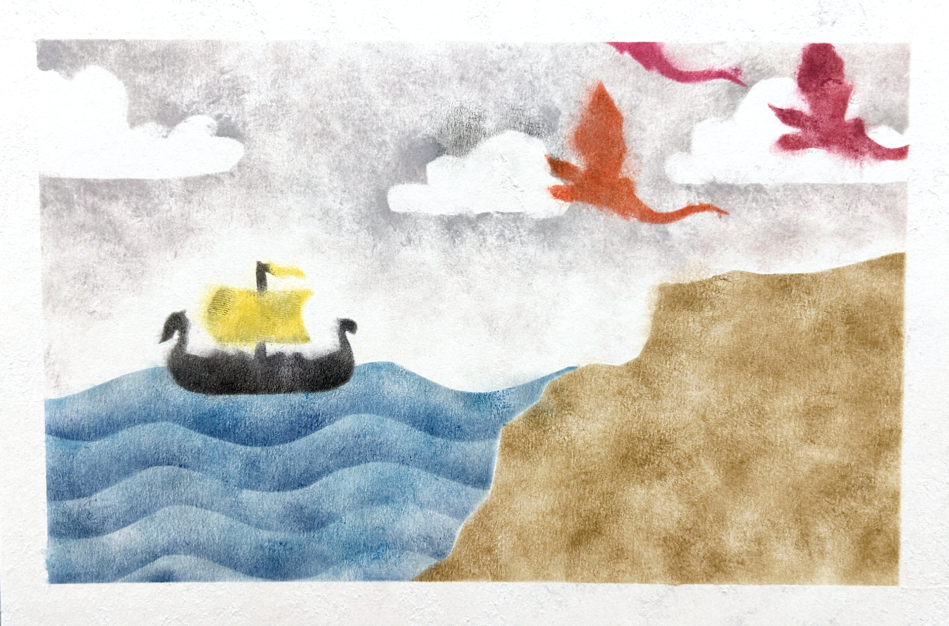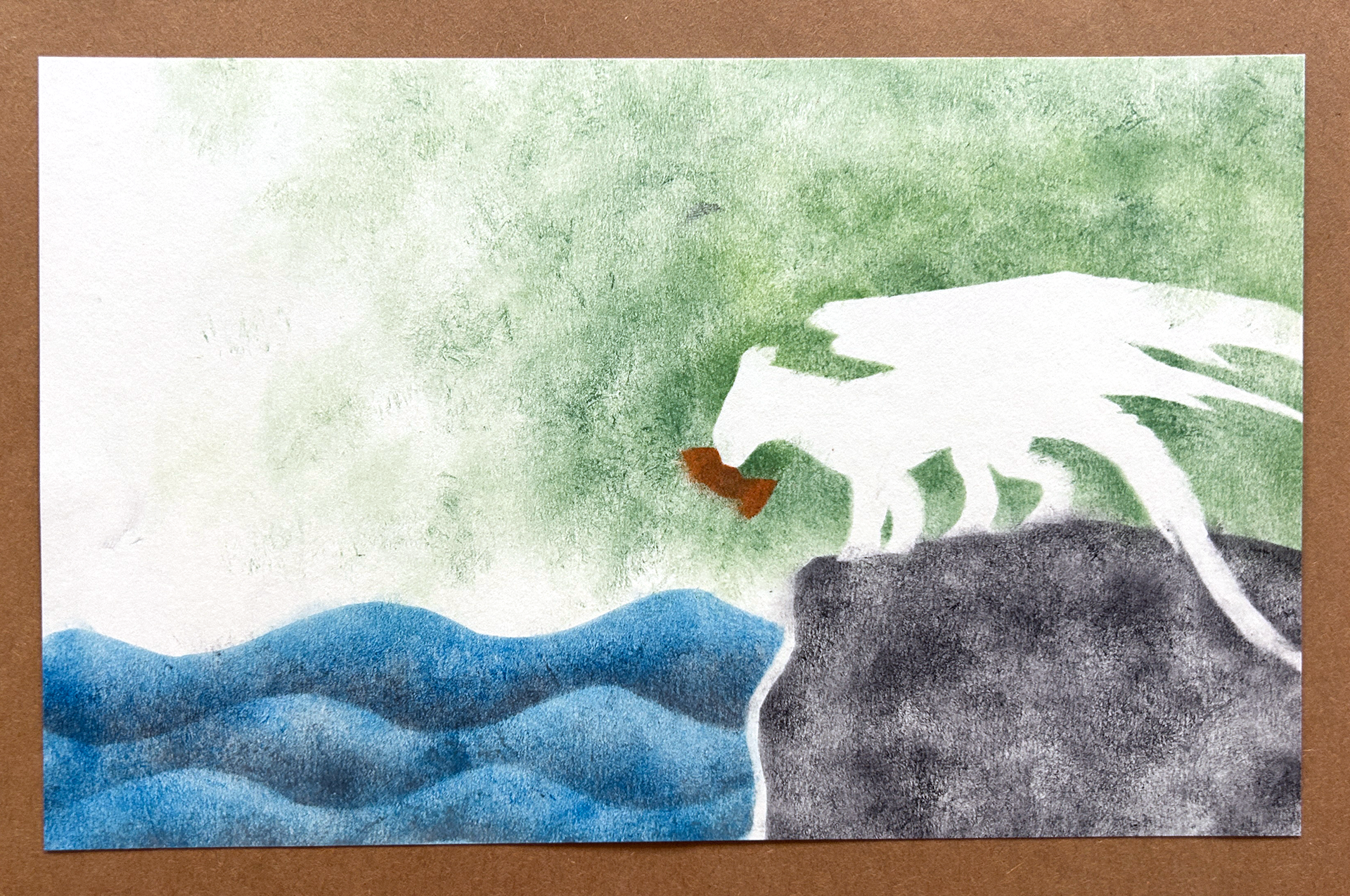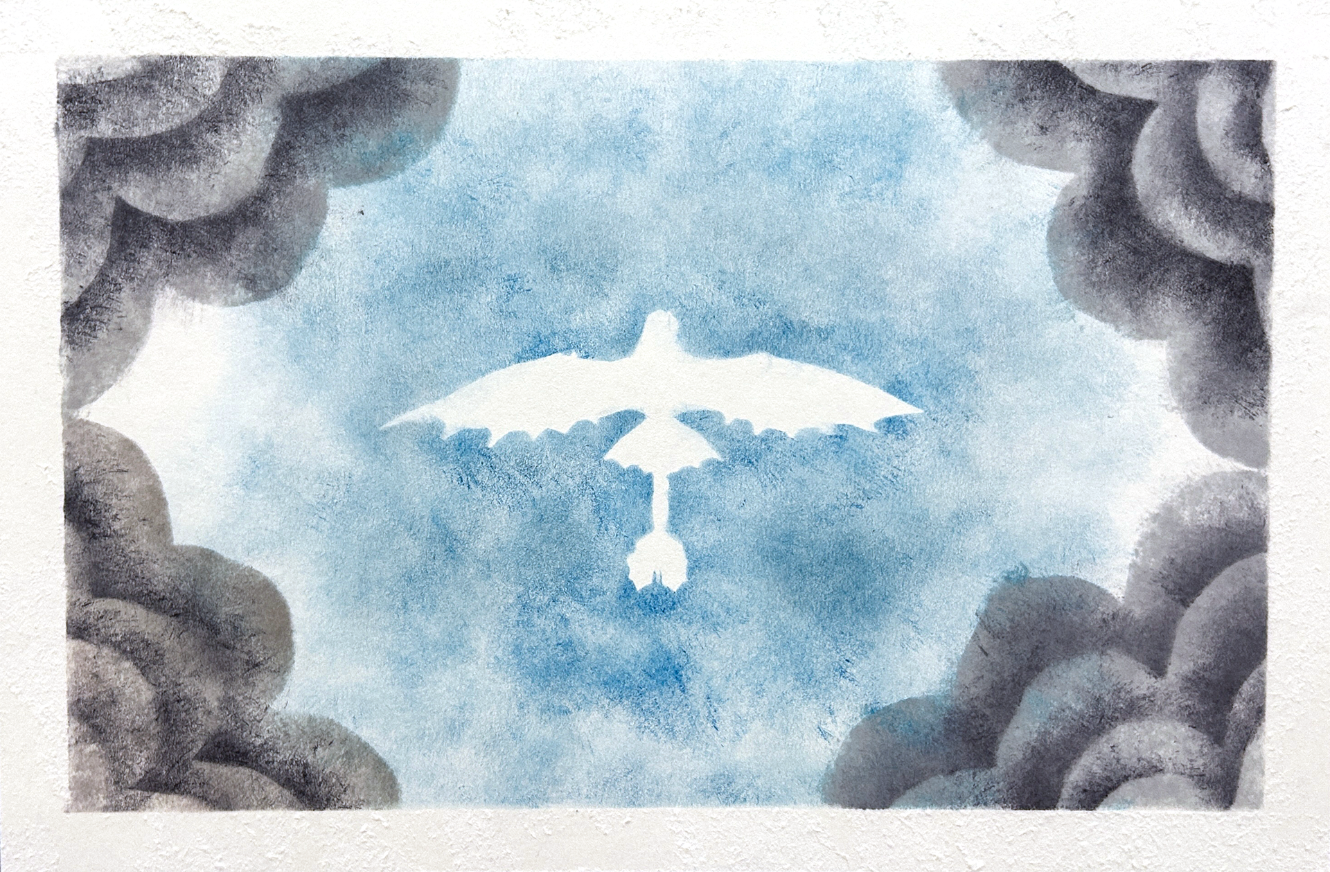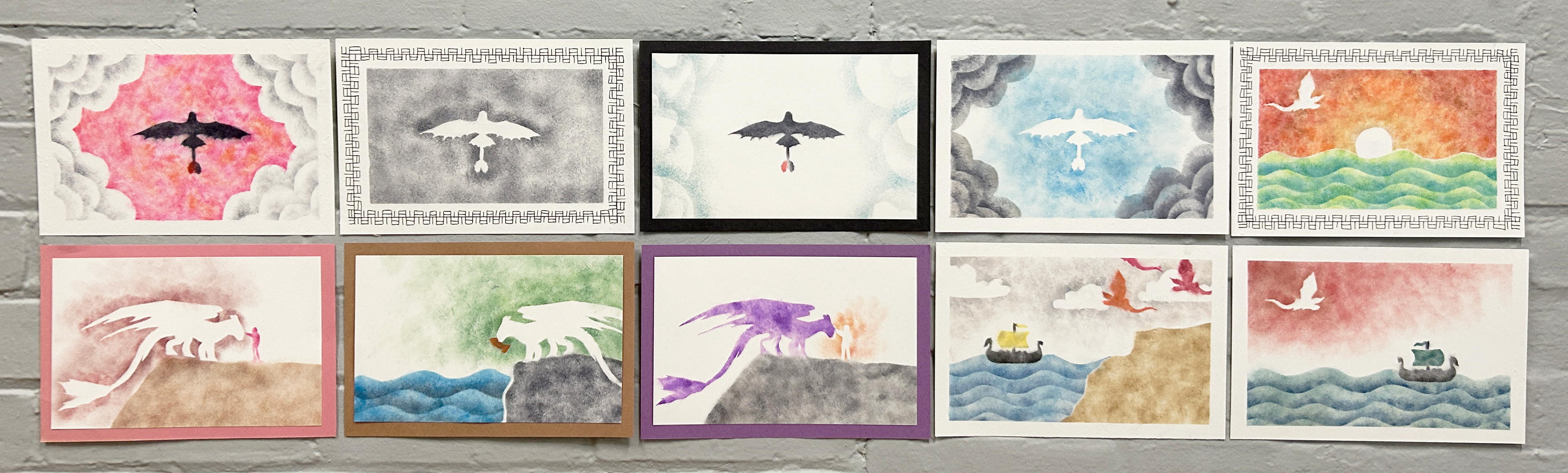 My pochoir print series is based on the 2010 film, How to Train Your Dragon. The film features vibrant environments and iconic creatures, so I aimed to capture that whimsy in my art. I experimented with negative and positive silhouettes, as well as the use of color. Through my experimentation, I discovered a method of layering negative stencils on top of one another to add texture. This method can be seen in the waves and clouds of my prints, creating a sense of depth.