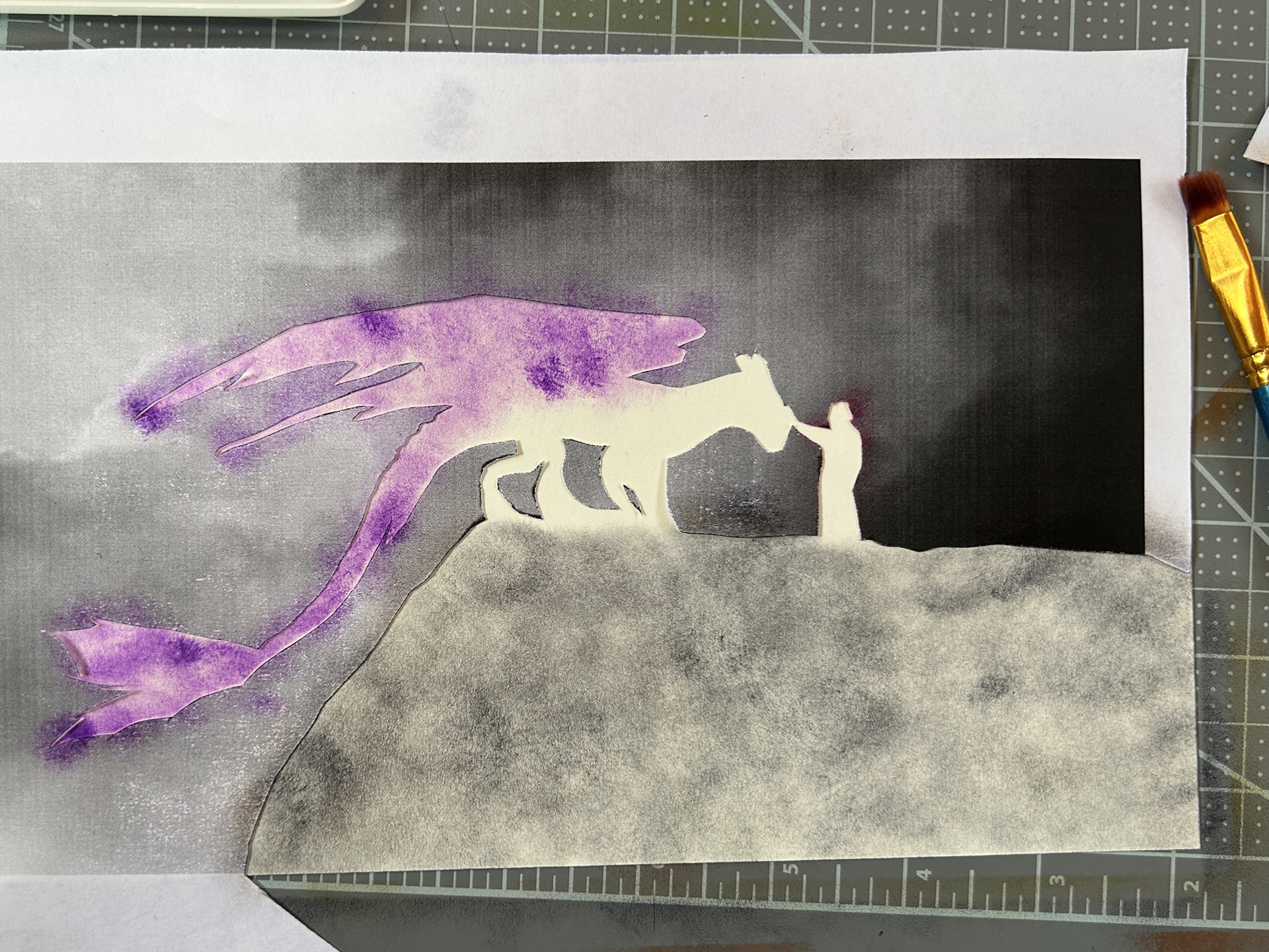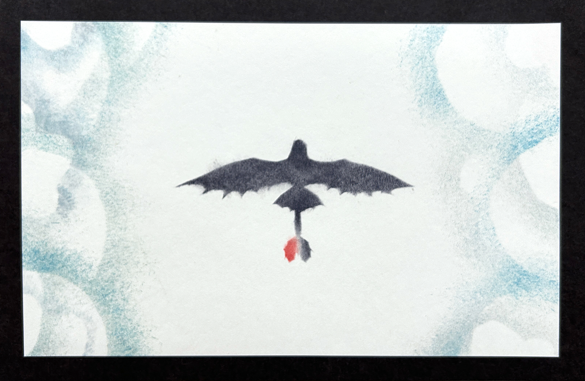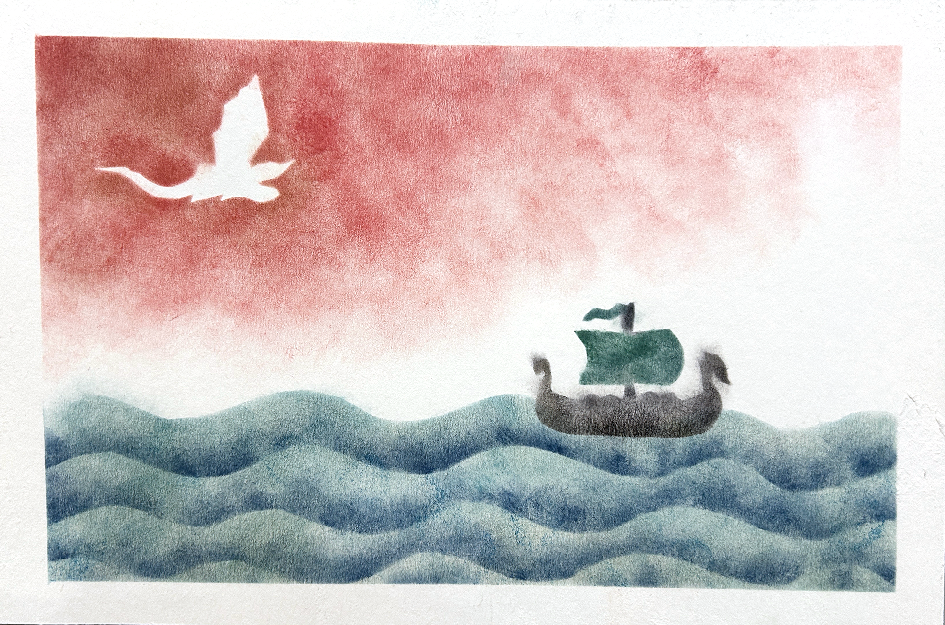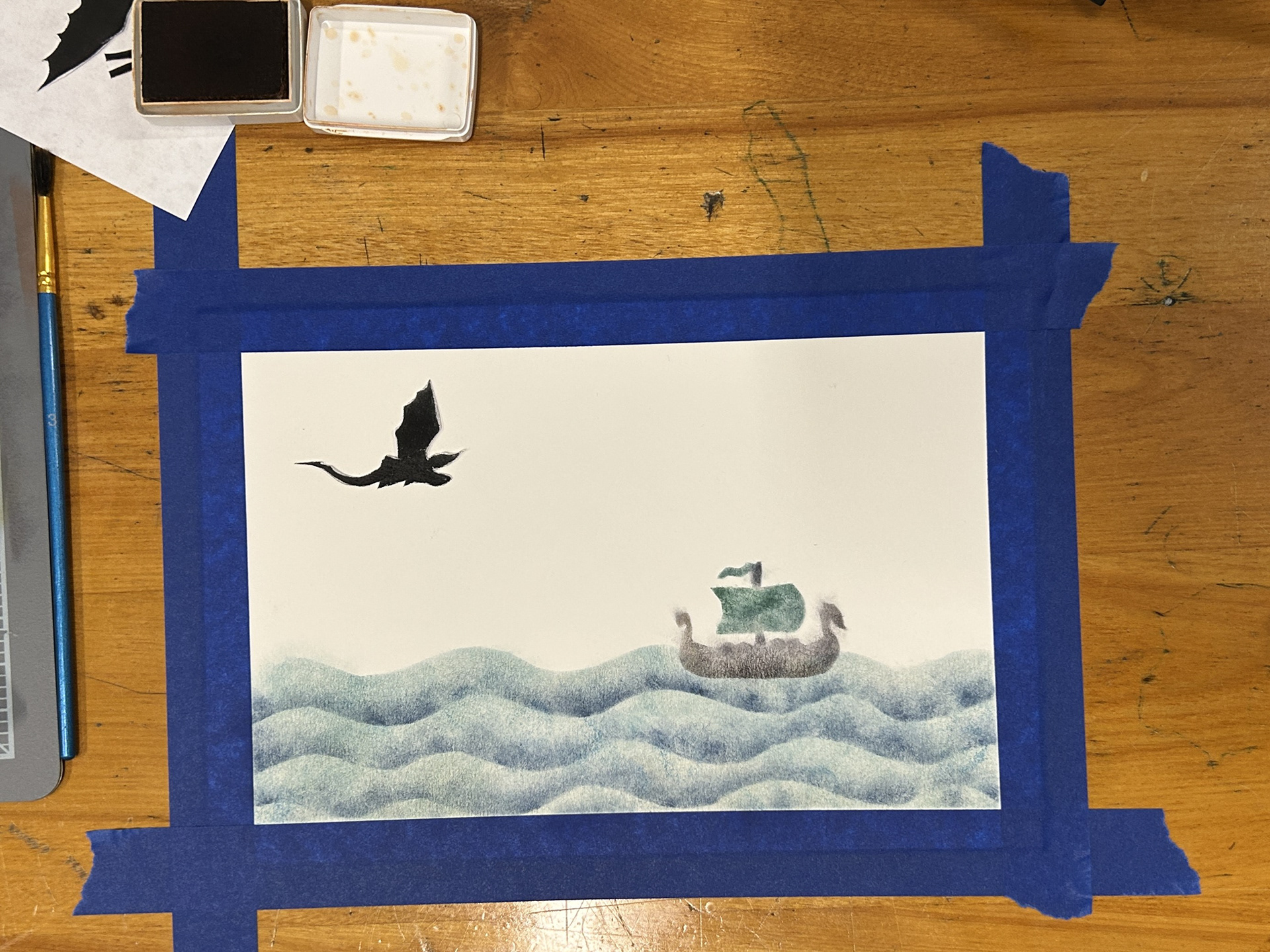 My pochoir print series is based on the 2010 film, How to Train Your Dragon. The film features vibrant environments and iconic creatures, so I aimed to capture that whimsy in my art. I experimented with negative and positive silhouettes, as well as the use of color. Through my experimentation, I discovered a method of layering negative stencils on top of one another to add texture. This method can be seen in the waves and clouds of my prints, creating a sense of depth.