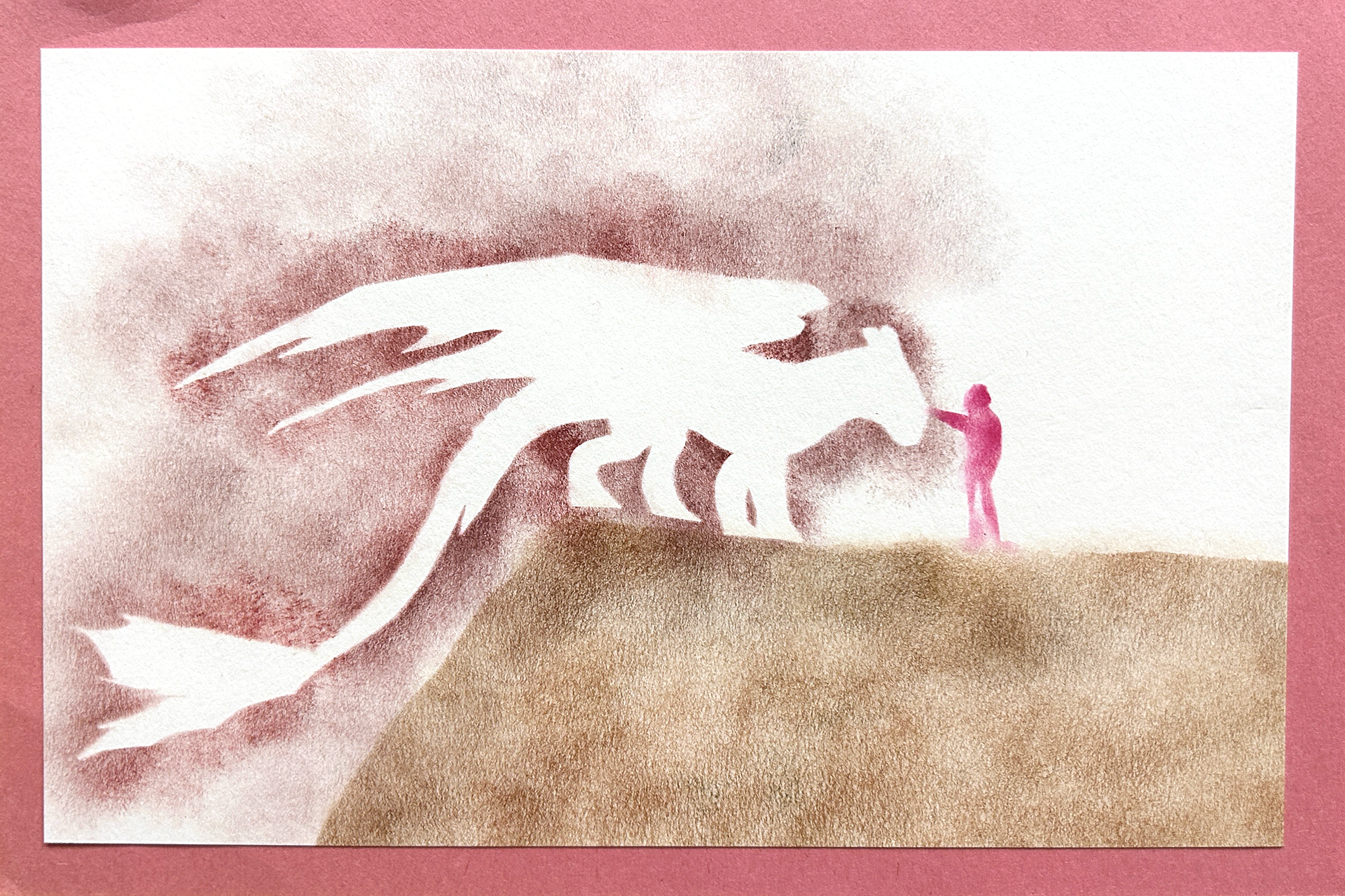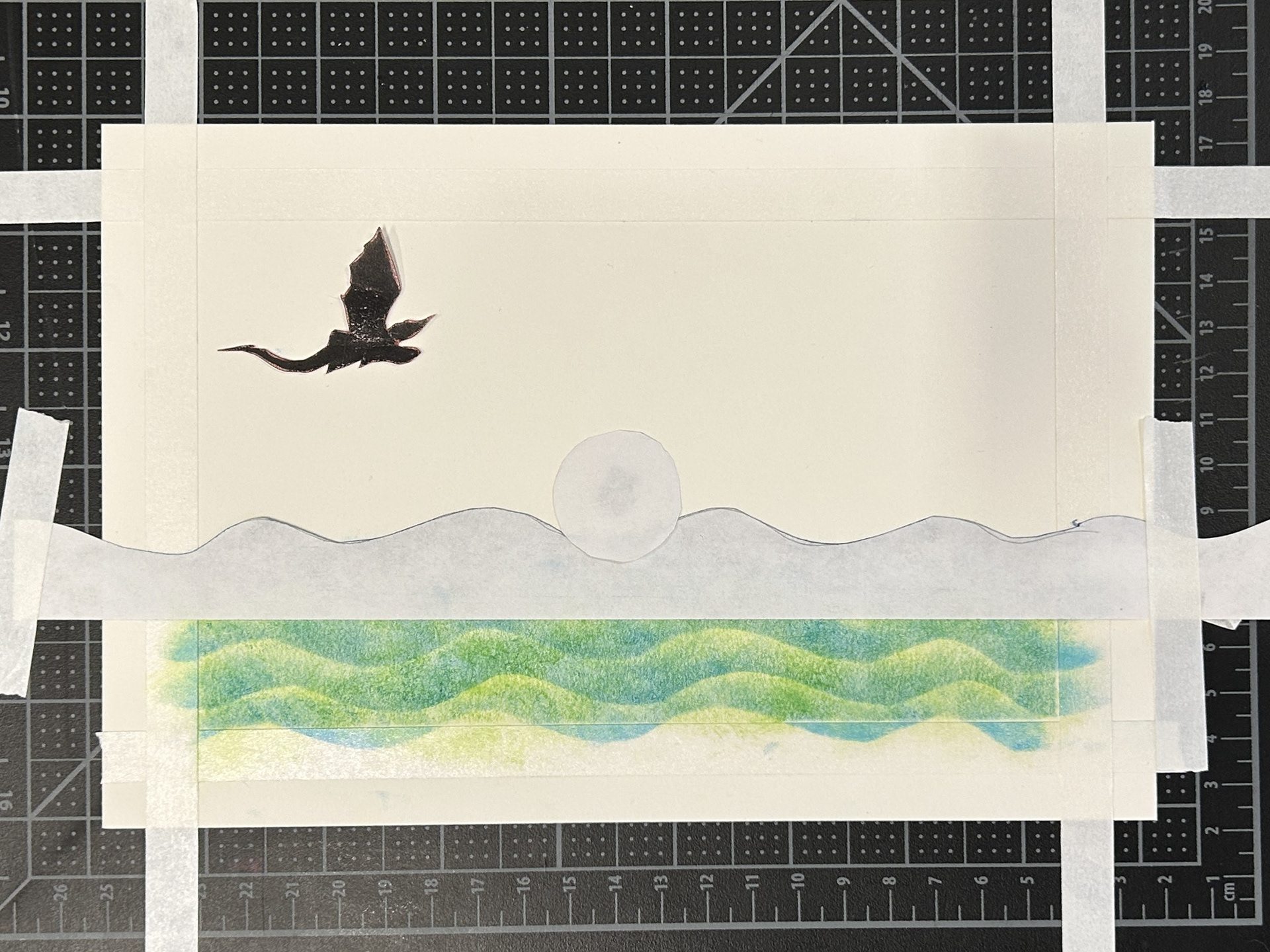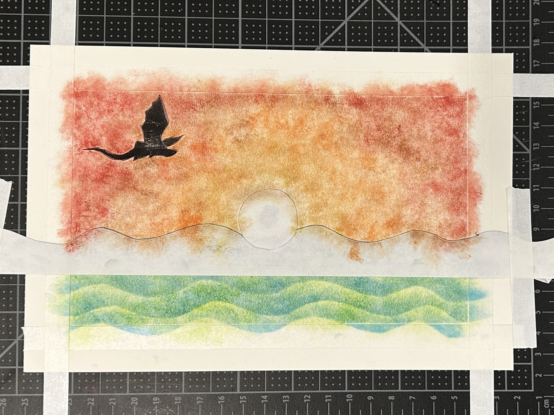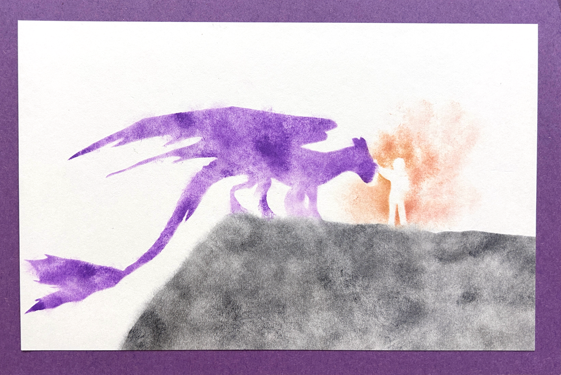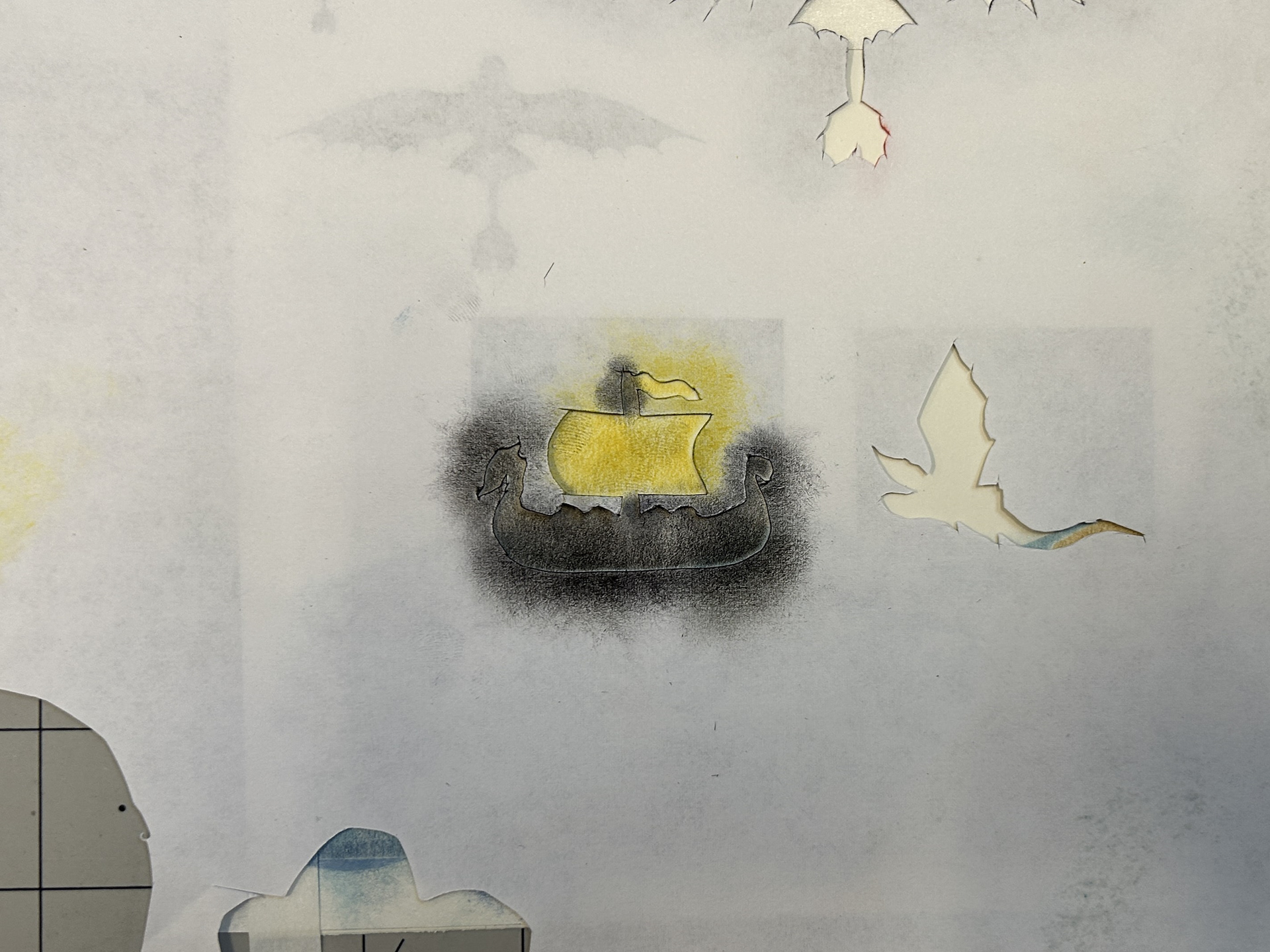 My pochoir print series is based on the 2010 film, How to Train Your Dragon. The film features vibrant environments and iconic creatures, so I aimed to capture that whimsy in my art. I experimented with negative and positive silhouettes, as well as the use of color. Through my experimentation, I discovered a method of layering negative stencils on top of one another to add texture. This method can be seen in the waves and clouds of my prints, creating a sense of depth.