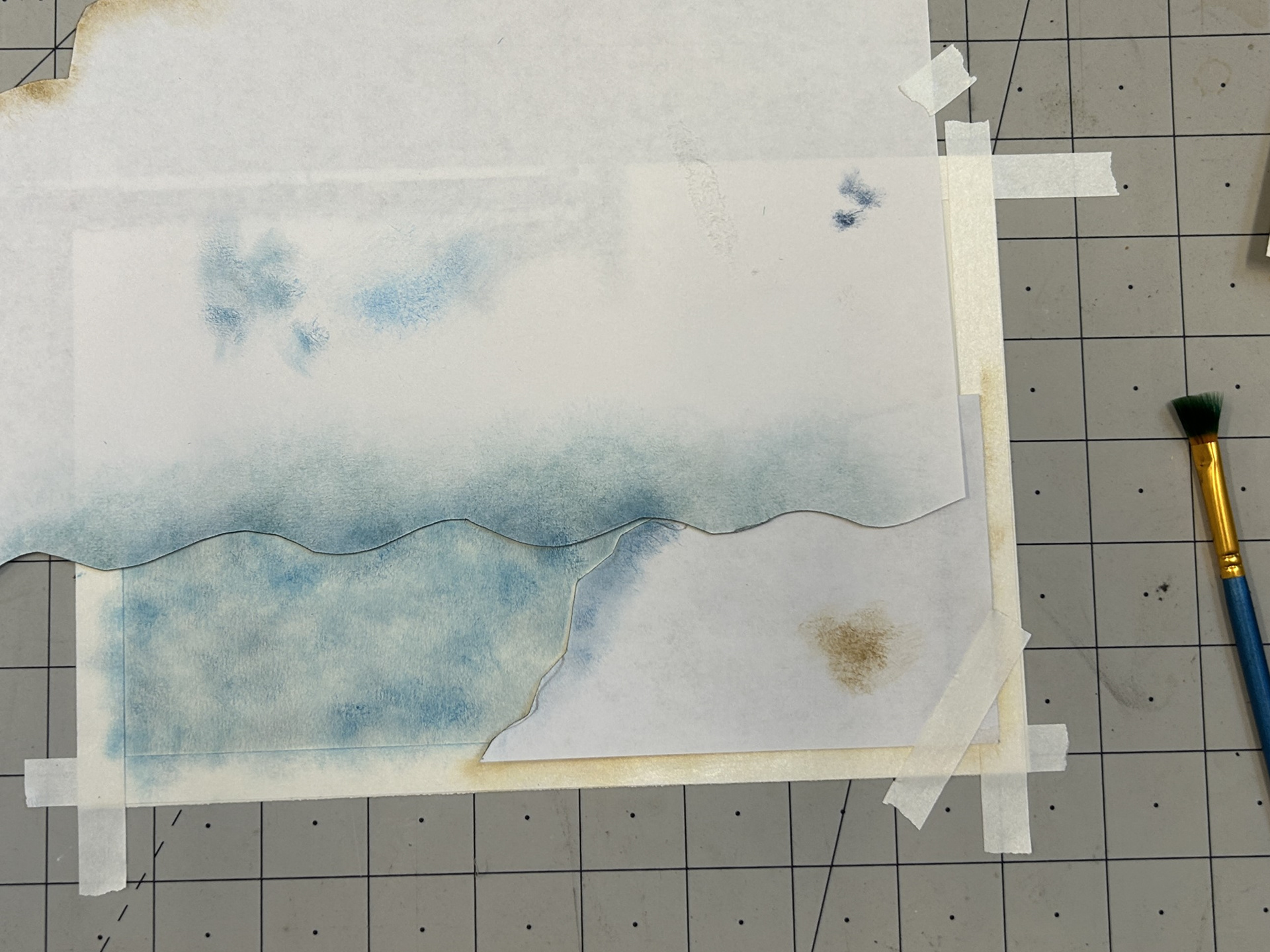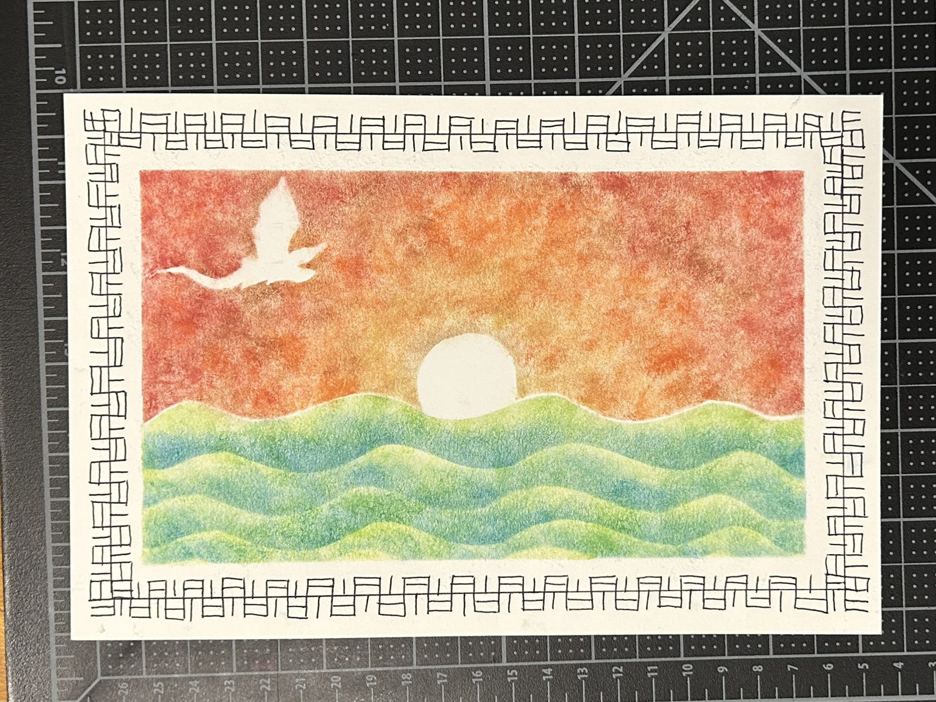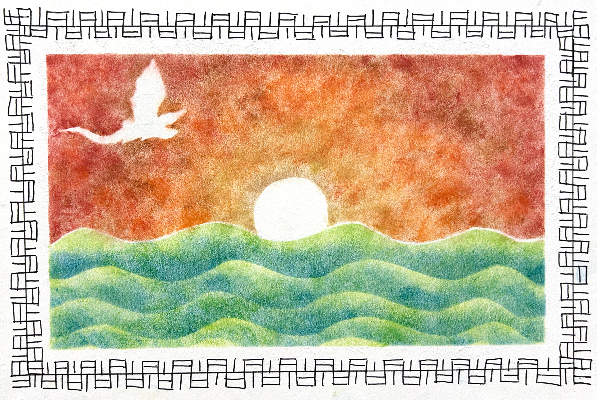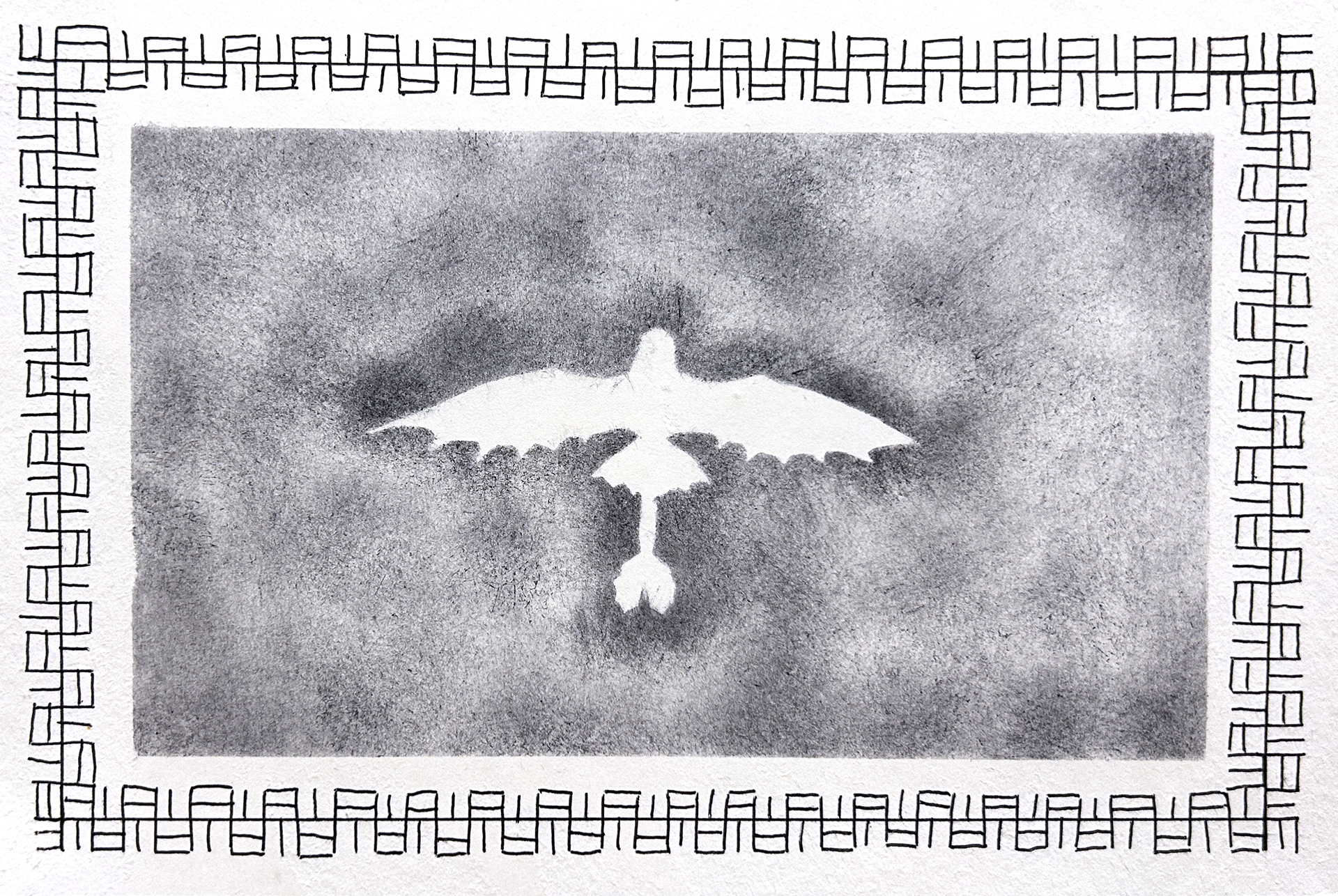 My pochoir print series is based on the 2010 film, How to Train Your Dragon. The film features vibrant environments and iconic creatures, so I aimed to capture that whimsy in my art. I experimented with negative and positive silhouettes, as well as the use of color. Through my experimentation, I discovered a method of layering negative stencils on top of one another to add texture. This method can be seen in the waves and clouds of my prints, creating a sense of depth.