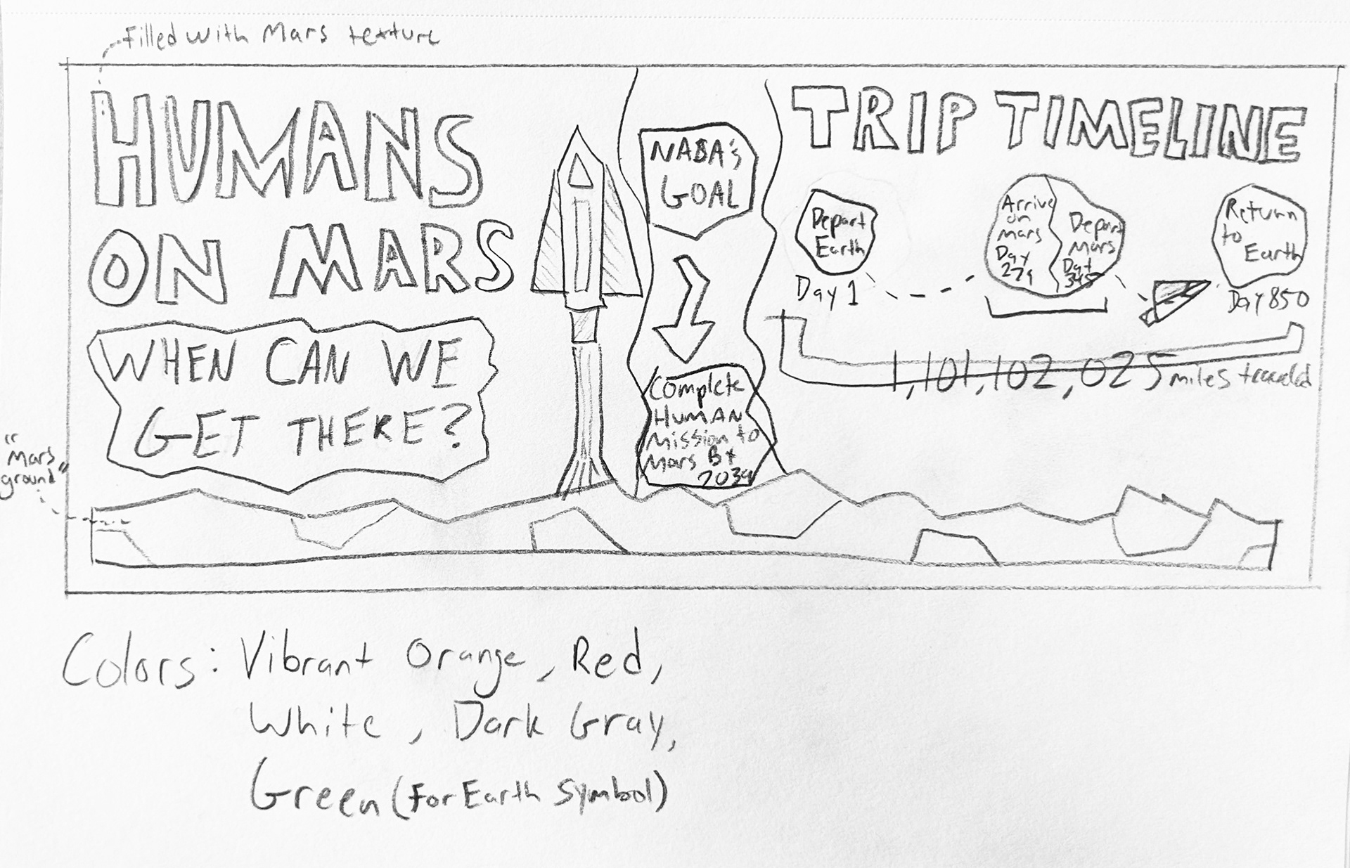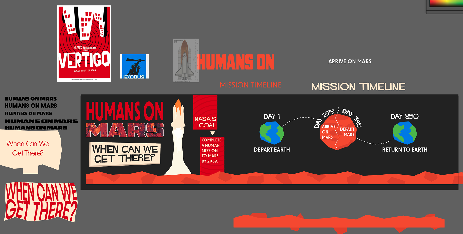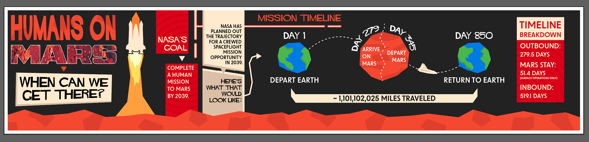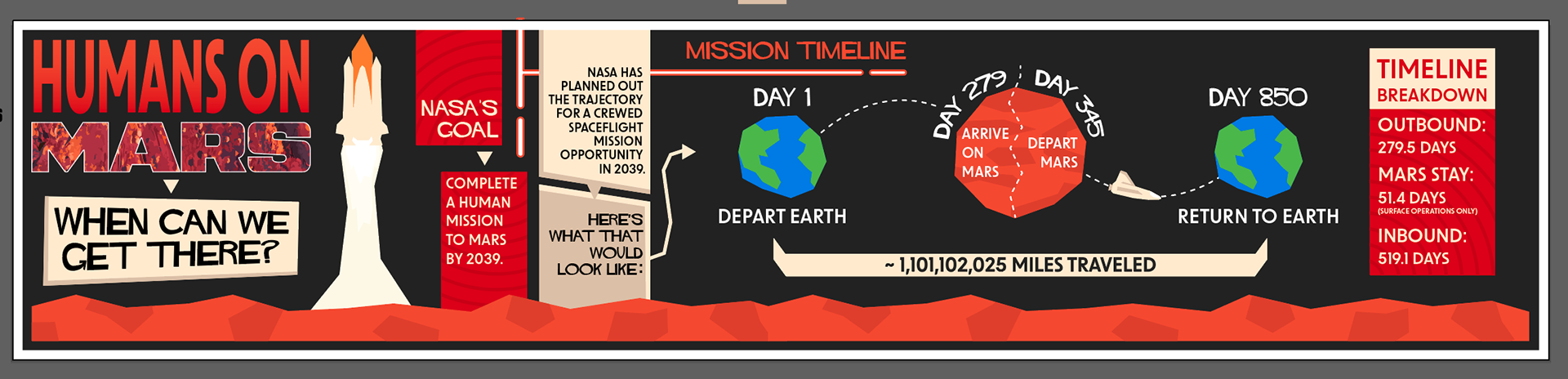 For this infographic, I aimed to capture the timeless style of Saul Bass through an exploration of my personal interest in space travel. I drew inspiration from Bass's minimalistic, geometric shapes and vibrant, warm colors. I chose to illustrate a timeline for a potential upcoming Mars mission, providing a breakdown of how long each part of the trip would take.