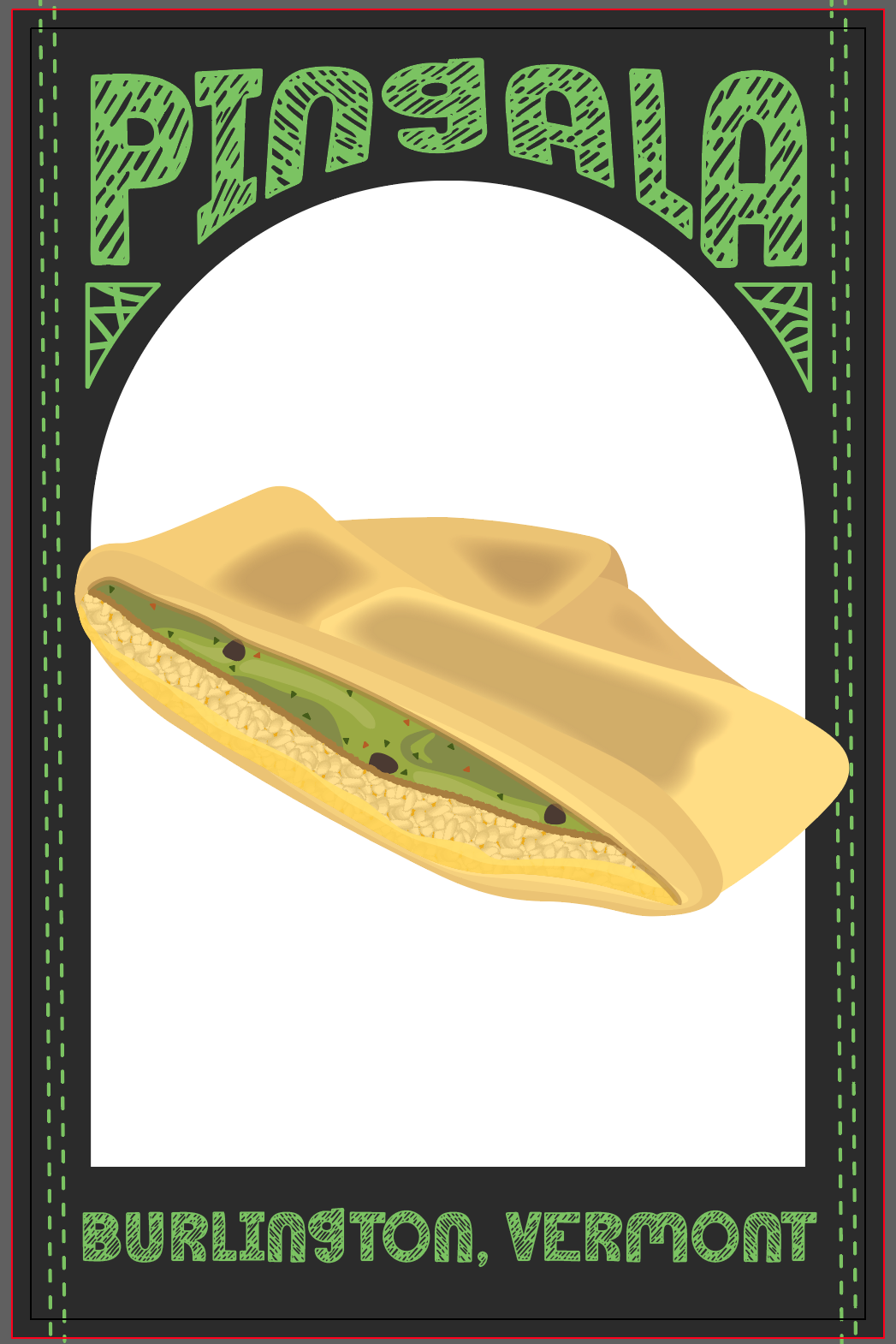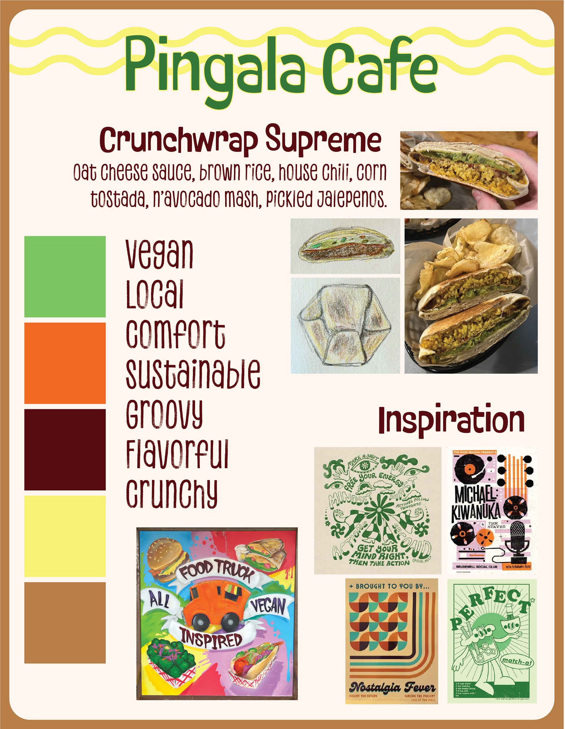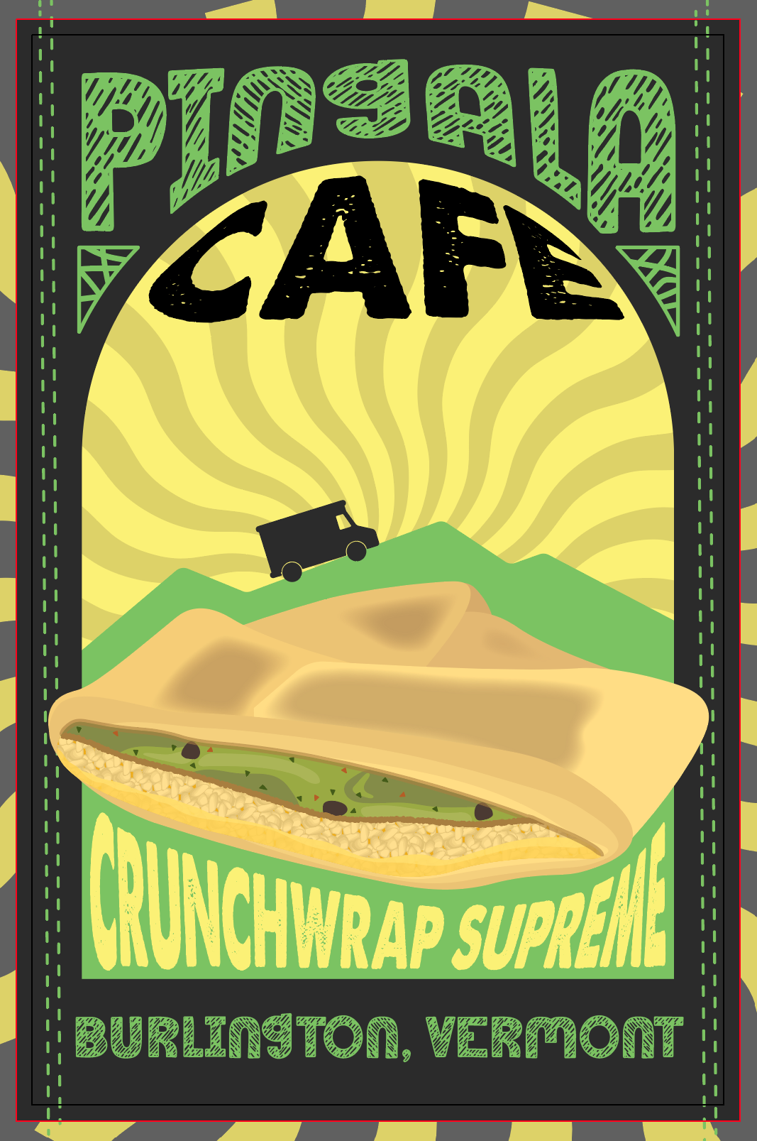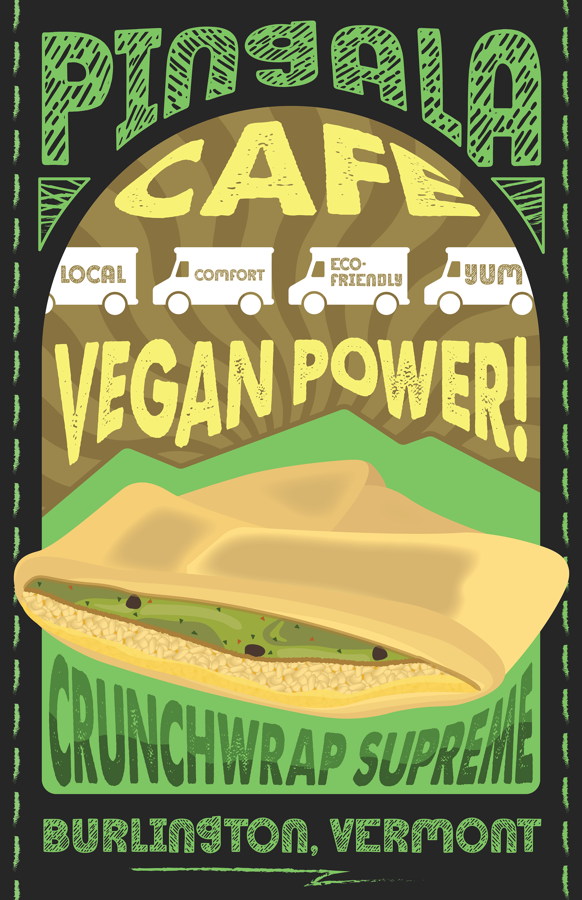 As a vegetarian, Pingala has been my favorite restaurant for years because their entire menu is completely vegan. They have two cafe locations in Burlington, each with unique character and charm. Pingala values environmental sustainability and social justice, which can be seen in their physical environment and their food. My poster design took inspiration from the hand-drawn blackboards in their cafes, and I tried to lean into the groovy vibes of their locations. I featured green mountains behind the crunchwrap to emphasize that they are local to Vermont (the Green Mountain state), and I included food trucks in reference to their "Food Truck Inspired" slogan. The goal of the poster is to embody Pingala's values through the use of fun, eye-catching visual elements.