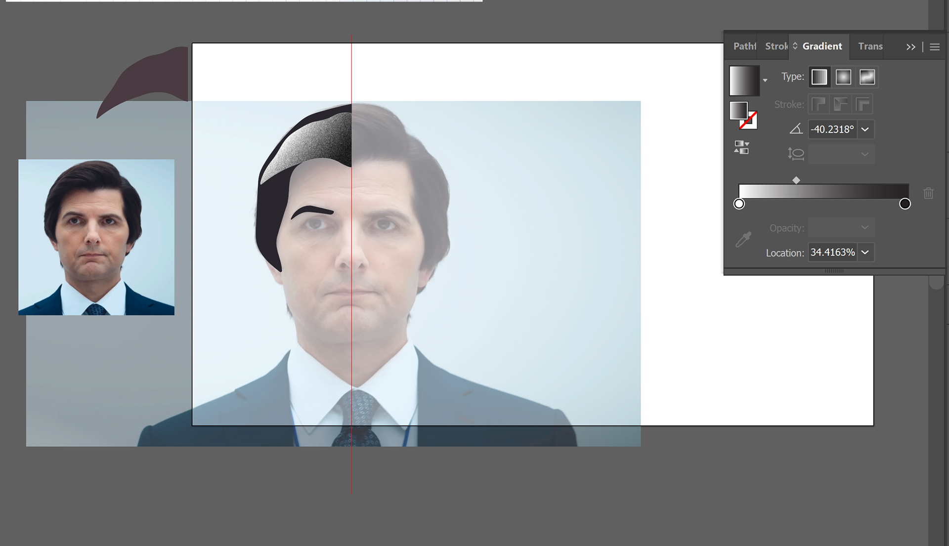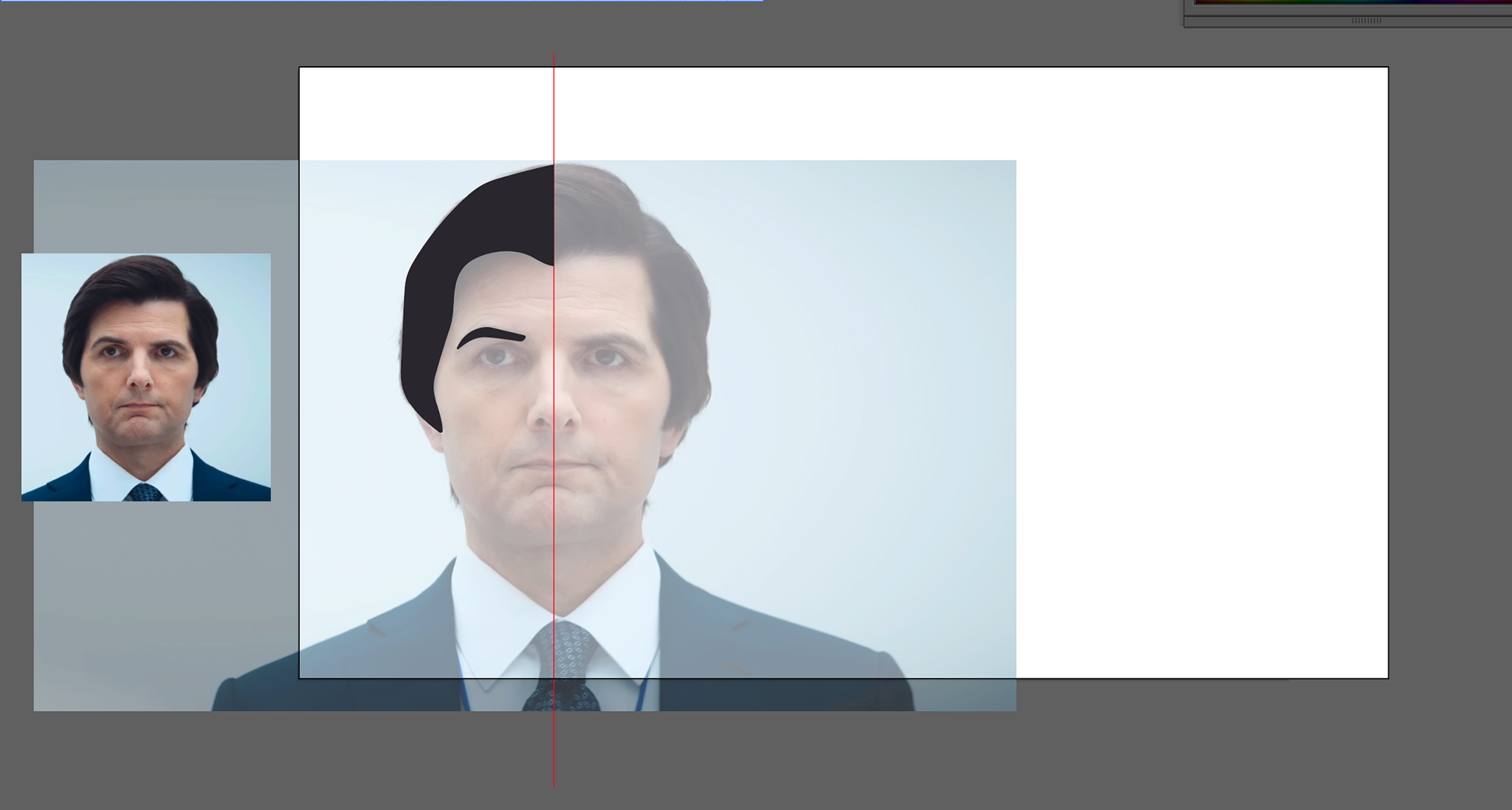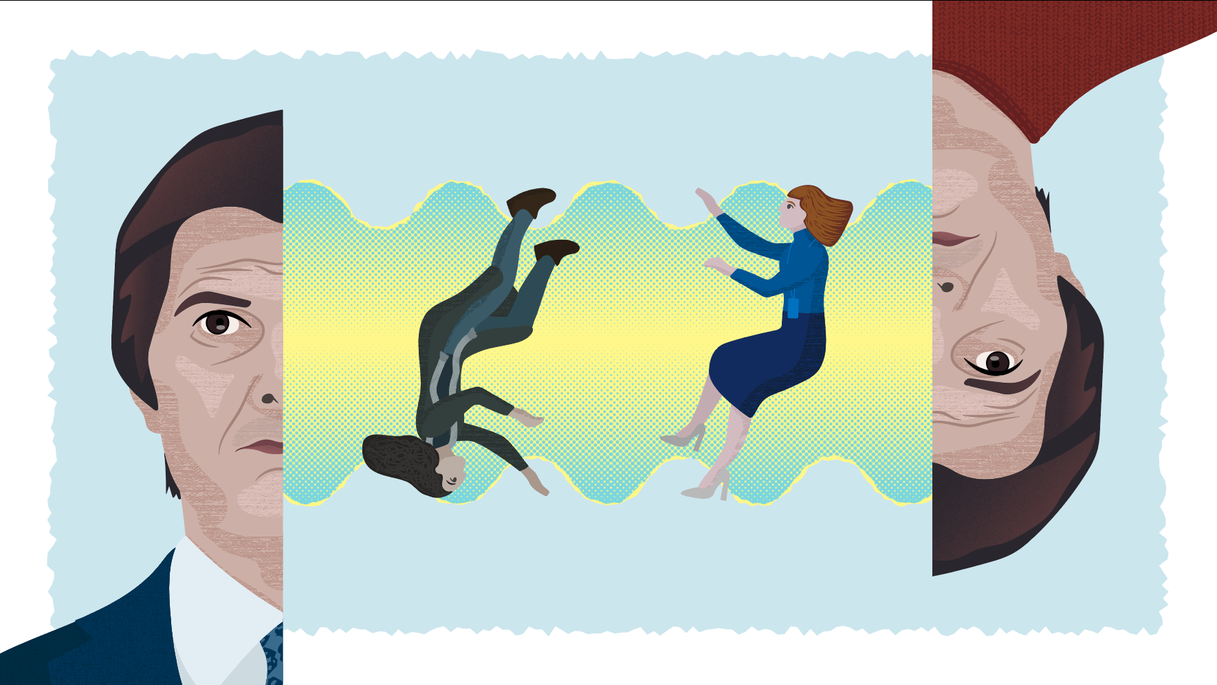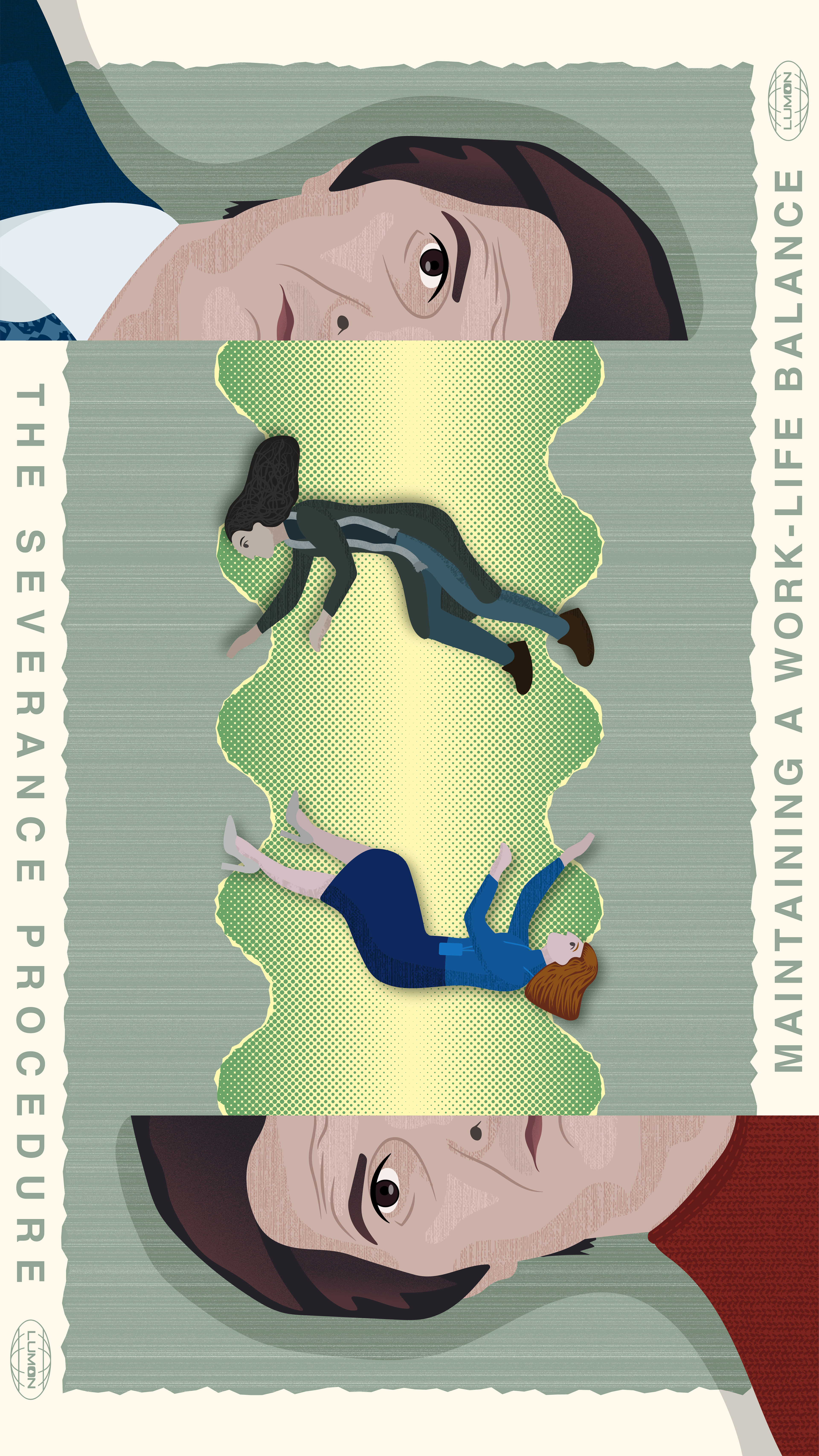 Severance is a science fiction thriller TV series about a team of office workers whose memories have been surgically divided between their work and personal lives. Through my illustration, I aimed to convey the psychological conflict between Mark's work self and outside self (innie and outie). The wavy vortex represents the separation of Mark's mind. Each part of his mind has distinct values and cares about different people, so within the vortex I depicted the two people that Mark's innie and outie care most about.