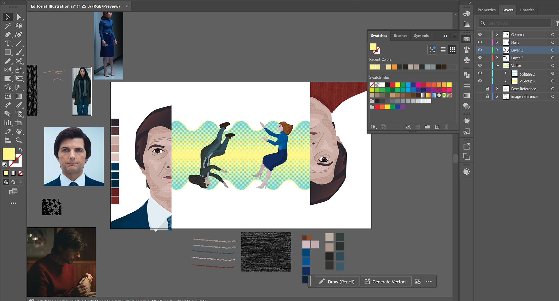 This project focused on creating an editorial illustration inspired by a book, article, TV series, or topic of personal interest. The objective was to develop a visual concept that effectively conveyed the message or themes of the source material while establishing a distinct illustrative voice. The work incorporated textures drawn from nature, interiors, architecture, everyday objects, and patterns to enrich the composition and add depth to the visual narrative. The goal was to explore the relationship between imagery, texture, and meaning, using illustration as a tool for storytelling and conceptual expression.